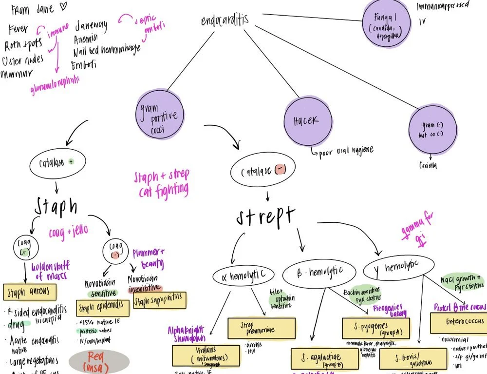 Learning to think like a test-writer really came into play here. The questions in Term 4 are no longer straightforward toss and retrieve. It took me a long time to realize that questions will be written to point you to a certain answer. Sounds simple, but when drowning in all the content they throw it can be tempting to just try and catch everything. For micro, I found it most helpful to see the most defining aspects of a bug. There’s a cleaner version of this chart in First aid, but writing this out helped me see the defining characteristics and the situations where you’d be looking at a certain bug. Like IV drug use + endocarditis, jump on Staph Aureus!