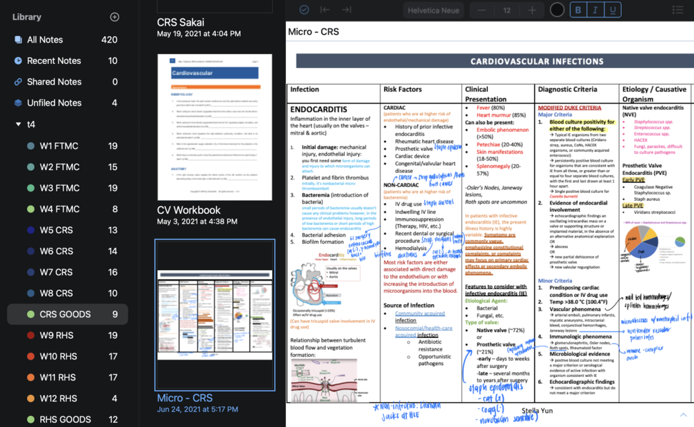 I officially stopped writing my own notes in CRS for time’s sake. That seems to be the theme of Term 4, not enough time. I made a folder called “CRS Goodies” where I put summary charts and student notes. I would have one note per system and subject like “MICRO - Cardio” and “ MICRO - Renal”. This felt more efficient because I wouldn’t have to look through each lecture to find things. I would annotate these pre-made materials with things I picked up in Pathoma, my sketchy pictures, and B&B. Honestly, it was difficult to pull away from writing my own notes. I was nervous that I wouldn’t retain anything because notes have been my way of slowing down to get to know the material. However, it freed up so much more time to do the scary amount of Anki cards I had to do. I actually ended up retaining more information since I had more time for Anki, practice questions, and workbooks.